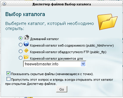Интересно заметить, что авторы всех, просмотренных мною статей в интернете, на тему файла .htaccess, указывая его местонахождение, забывали обратить внимание на то, что файлы с точкой в начале являются скрытыми. Для отображения таких файлов, например, в панели управления хостингом cPanel, при открытии диспетчера файлов, во всплывающем окне выбора каталога, нужно поставить галочку на опции "Показывать скрытые файлы (начинающиеся с точки)".